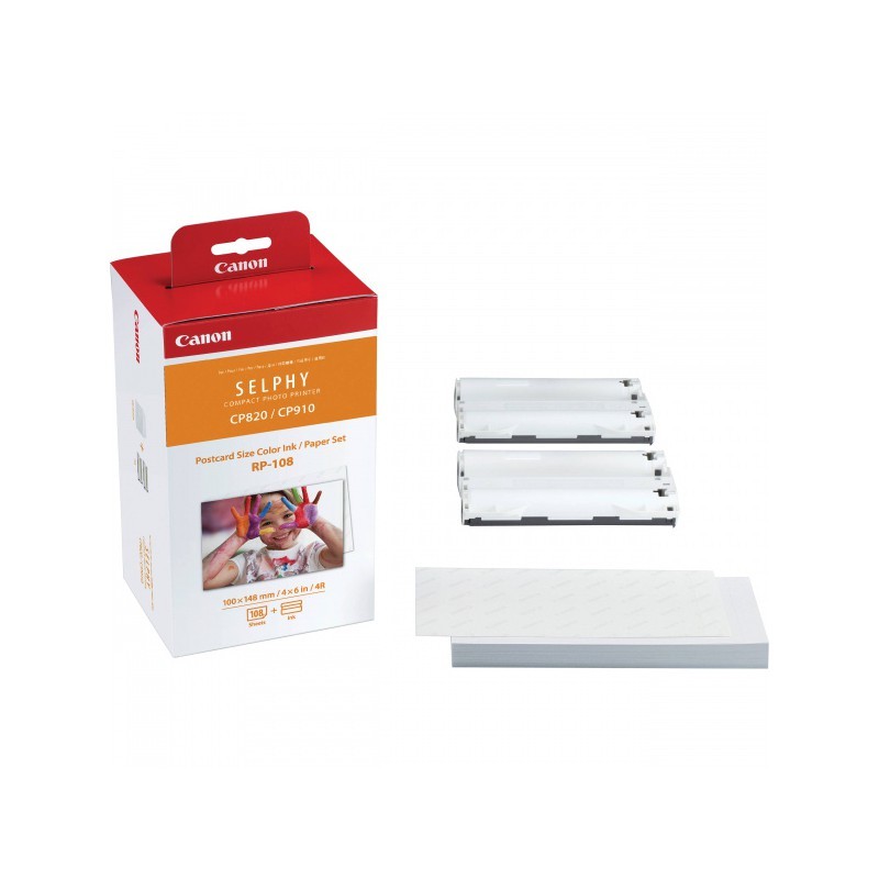 Confezione originale Canon per stampanti SELPHY, 108 fogli + cartuccia colore. Stampe fotografiche con colori vividi e dettagli nitidi, resistenti a graffi, acqua e impronte.