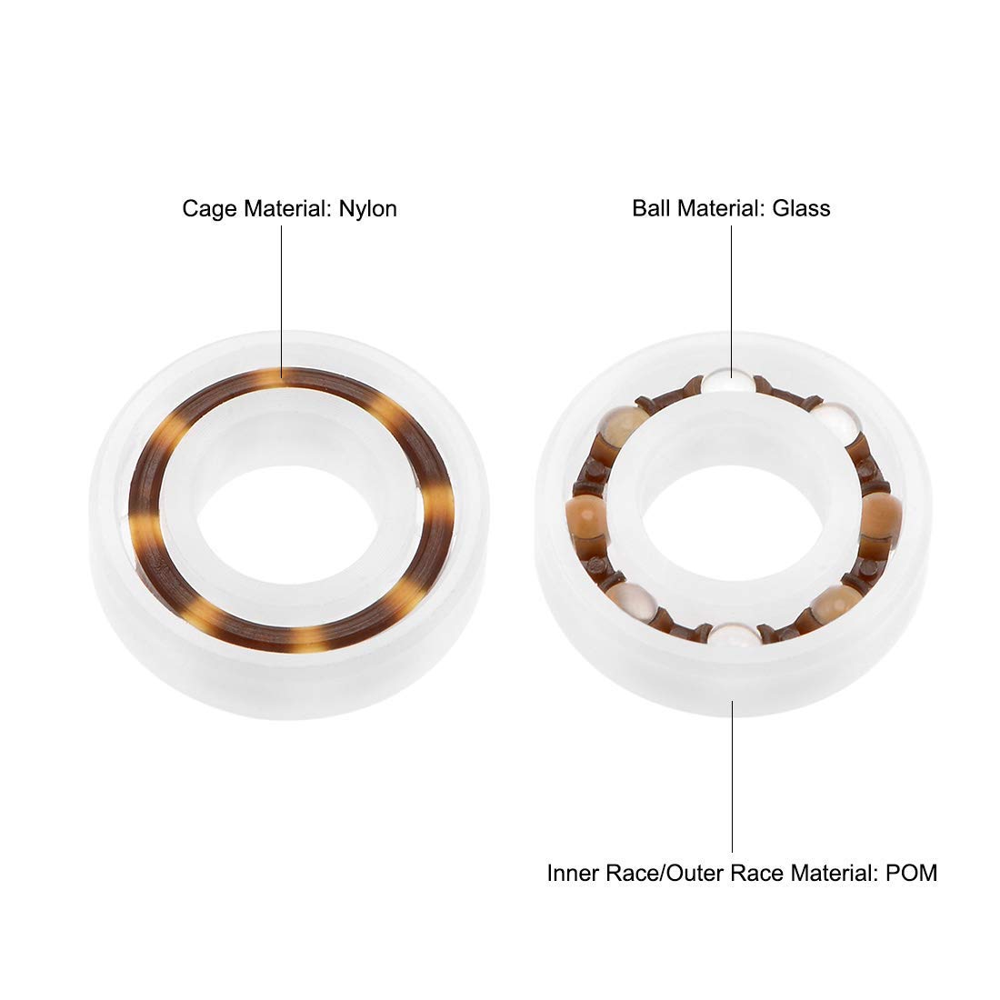 Cuscinetto a sfere 608 con sfere in vetro temperato e gabbia in POM (poliossimetilene), ideale per applicazioni meccaniche e industriali che richiedono resistenza alla corrosione, basso attrito e lunga durata.